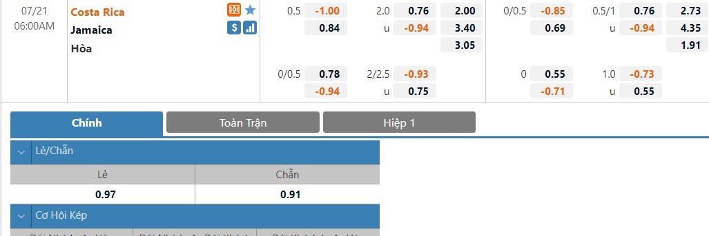 Tip kèo tỷ số hiệp 1: Costa Rica 1-1 Jamaica