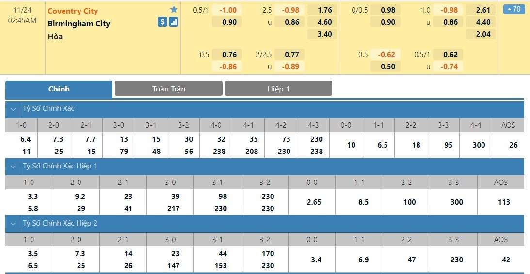 Tip kèo tỷ số full time: Coventry 1-0 Birmingham