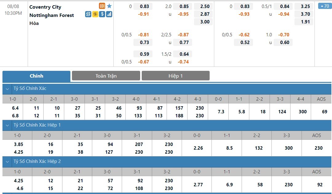 Tip kèo tỷ số hiệp 1: Coventry 1-1 Nottingham Forest