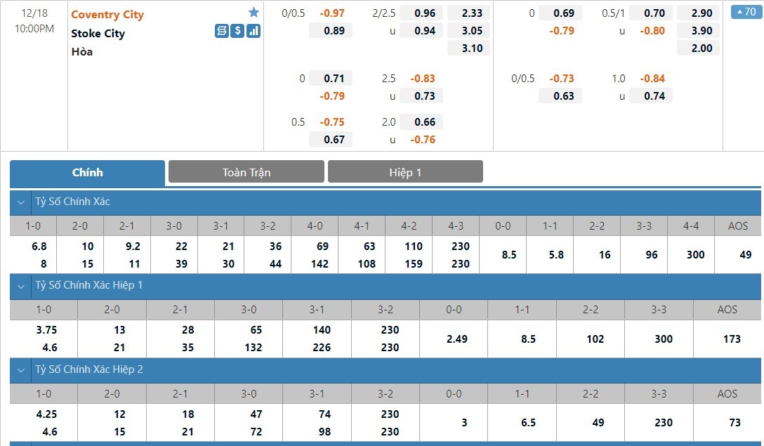 Tip kèo tỷ số hiệp 1: Coventry 0-0 Stoke