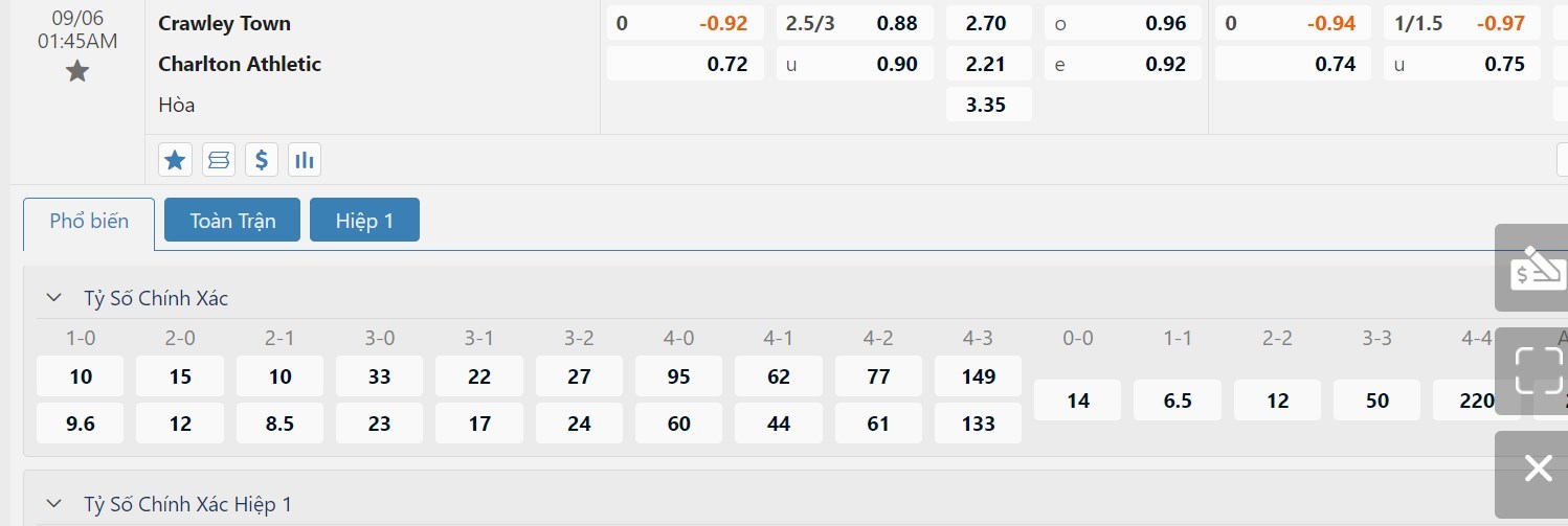 Tip kèo tỷ số hiệp 1: Crawley Town 0-1 Charlton Athletic