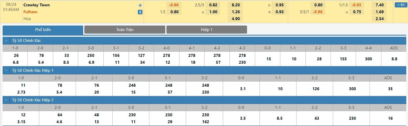 Trong lần gần đây nhất đôi bên đụng độ nhau thì Fulham là đội bóng phải làm khách nhưng họ đã thể hiện đẳng cấp vượt trội. Dẫu vậy thì trong hiệp đấu đầu tiên, Crawley là đội bóng mang về bàn thắng mở tỉ số trước và phải mãi sau đó thì Fulham mới có thể gỡ hòa. Dẫu vậy, với sự chênh lệch lớn về mặt đẳng cấp như hiện tại thì với tỷ lệ kèo hiệp 1 là -3/4 trái, người chơi nên tin tưởng vào đội khách.
