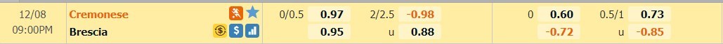 Tip kèo tỷ số hiệp 1: Cremonese 0-0 Brescia
