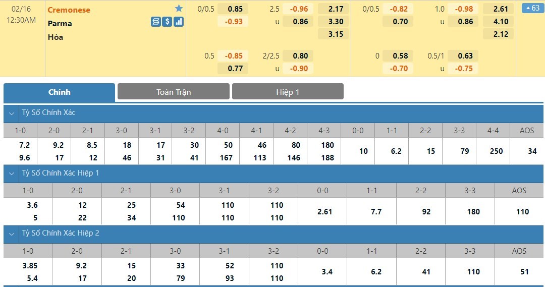 Thành tích thi đấu trên sân khách của Parma cũng không mang tới cho họ quá nhiều hy vọng. Thống kê cho thấy ở 5 chuyến hành quân xa nhà gần nhất đoàn quân của Giuseppe Iachini chỉ kiếm về cho mình 1 chiến thắng còn lại là 2 trận hòa và 2 thất bại. Vậy nên việc lựa chọn Parma ở kèo đấu này được xem là 1 quyết định vô cùng mạo hiểm. Trong quá khứ những cuộc chạm trán giữa Cremonese vs Parma vẫn thường khép lại mà không có quá nhiều bàn thắng được ghi. Cụ thể trong 5 lần gần nhất 2 đội gặp nhau thì đã có tới 4 trận khép lại với từ 2 pha lập công trở xuống. Đó cũng chính là nguyên do tại sao người chơi nên ưu tiên bắt xỉu ở kèo đấu này.