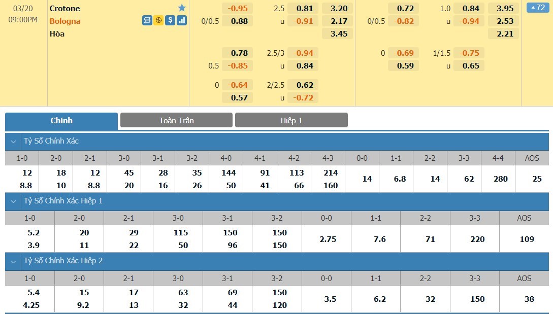 Tip kèo tỷ số hiệp 1: Crotone 0-0 Bologna