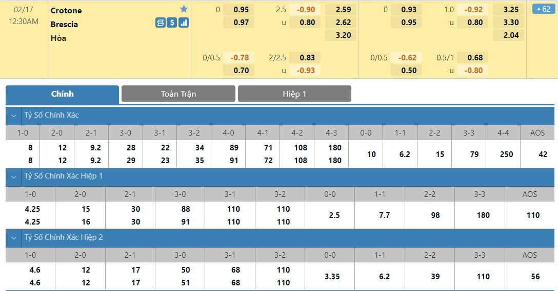 Tip kèo tỷ số hiệp 1: Crotone 1-2 Brescia