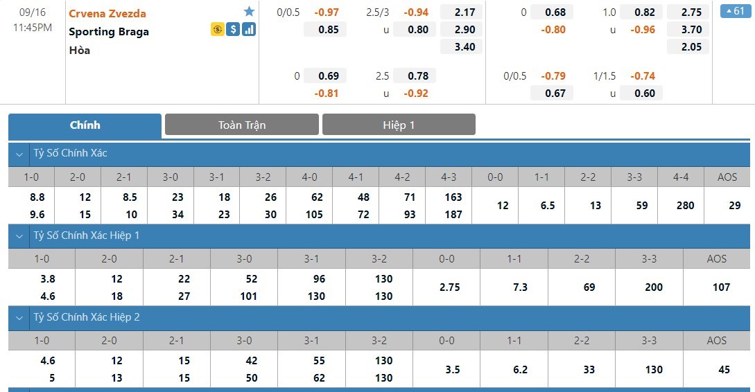 Tip kèo tỷ số hiệp 1: Crvena Zvezda 0-0 Braga