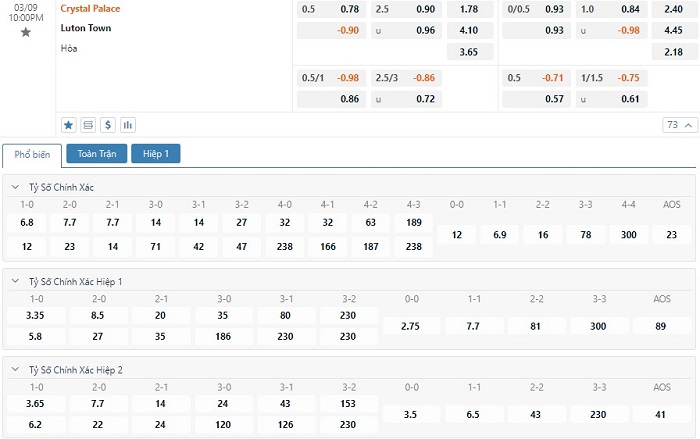 Tip kèo tỷ số hiệp 1: Crystal Palace 1-0 Luton Town