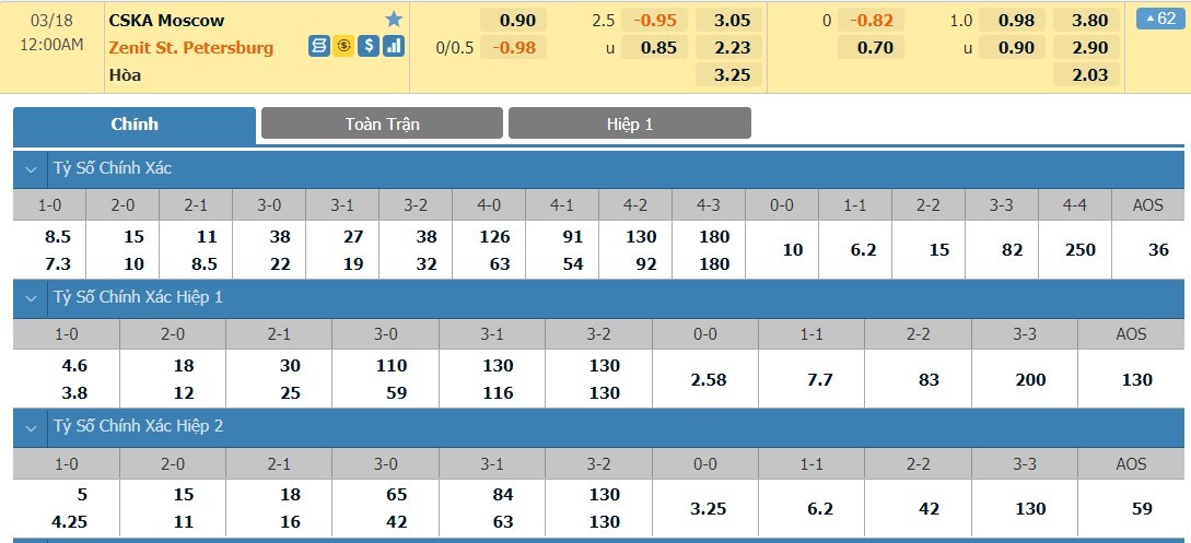 Tip kèo tỷ số hiệp 1: CSKA Moscow 0-0 Zenit St.Petersburg