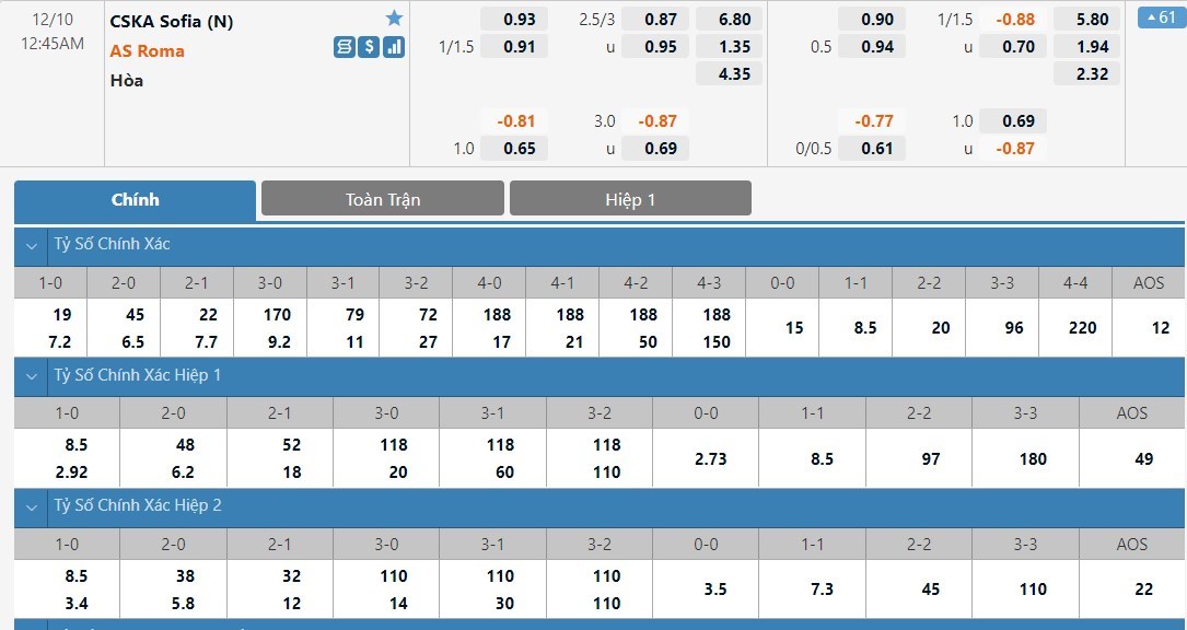 Tip kèo tỷ số hiệp 1: CSKA-Sofia 0-1 Roma