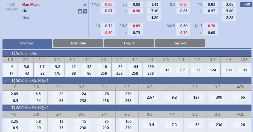 Tip kèo tỷ số hiệp 1: Đan Mạch 1-0 Australia