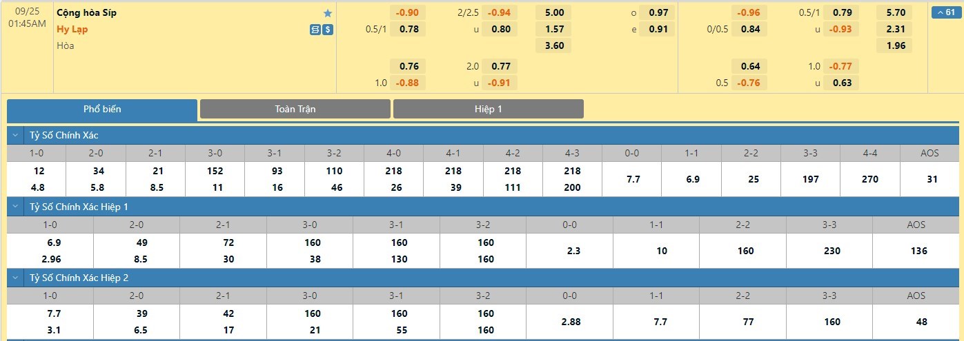 Trong 5 trận đấu gần nhất của mình, Đảo Síp đã có 2 trận đấu mang về được cho mình ít nhất là 1 bàn thắng trong hiệp đấu đầu tiên. Còn với Hy Lạp, đội bóng này cũng đã sở hữu 3 lần sút tung lưới đối phương trong 45 phút đầu tiên. Với tỷ lệ kèo hiệp 1 ở trận đấu này được đưa ra là -1/4 trái thì người chơi nên tin tưởng vào đội khách để có cơ hội thắng kèo cao hơn.