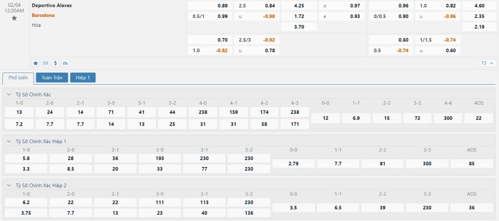 Tip kèo tỷ số hiệp 1: Deportivo Alaves 0-0 Barcelona