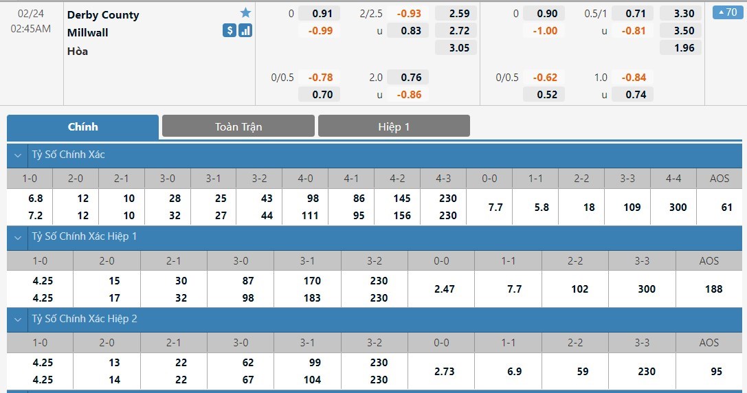 Đồng ý là Millwall đang có được thành tích thi đấu khá ấn tượng. Tuy nhiên đa phần những kết quả có lợi của họ đều tới trên sân nhà. Thống kê cho thấy ở 5 trận sân khách gần nhất Millwall chỉ kiếm về 1 chiến thắng còn lại là tới 4 thất bại. Vì vậy ở kèo đấu này thì Derby vẫn nên là lựa chọn ưu tiên của người chơi. Cả chủ nhà lẫn đội khách đều không mạnh trong khâu tấn công. Vì vậy những cuộc đụng độ giữa họ thường khá nghèo nàn về mặt bàn thắng. Thống kê cho thấy ở 5 lần gần nhất 2 đội gặp nhau thì chỉ có đúng 1 trận khép lại với nhiều hơn 2 pha lập công.