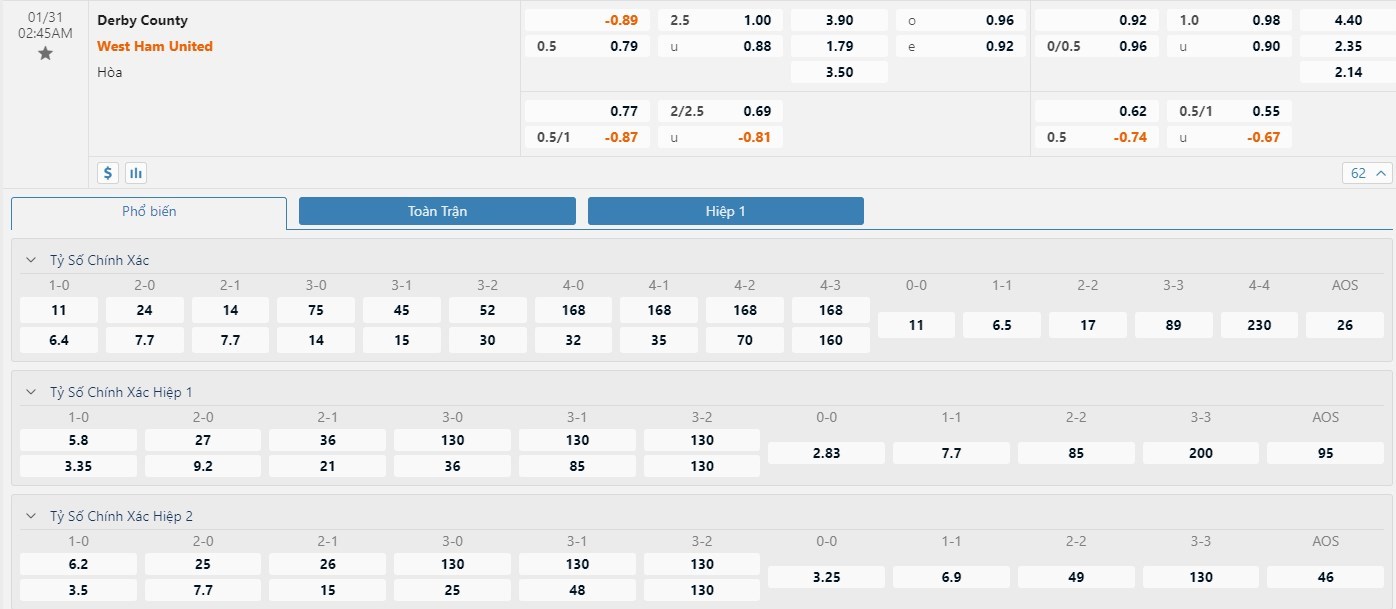 Trong 5 trận đấu gần nhất của mình, Derby đã có 4 trận đấu mang về được cho mình ít nhất là 1 bàn thắng trong hiệp đấu đầu tiên. Còn với West Ham, đội bóng này đã có 2 lần làm được điều này trong 45 phút đầu tiên. Với tỷ lệ kèo hiệp 1 là West Ham -1/4 trái thì người chơi nên tin tưởng vào đội khách trận này khi mà đẳng cấp giữa hai đội là khá xa nhau.