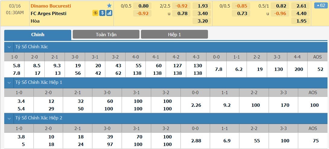 Tip kèo tỷ số hiệp 1: Dinamo Bucuresti 1-0 Arges Pitesti