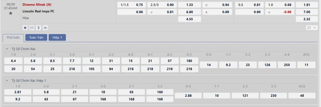 Dinamo Minsk là đội bóng được đánh giá cao hơn hẳn với mốc chấp -1 1/4 trái ở trận đấu lượt đi. Đương nhiên, Dinamo Minsk sẽ đặt quyết tâm để tạo nên lợi thế dẫn bàn lớn để tự tin trong trận đấu lượt về diễn ra sau đó. Đây là nhiệm vụ nằm trong khả năng của Dinamo Minsk nếu như họ tiếp tục duy trì được trạng thái phong độ ổn định. Dù trận đấu này sẽ diễn ra tại sân trung lập nhưng việc nhà cái đưa ra mốc chấp sâu như vậy đủ để thấy đội ngũ chuyên môn nhận định đẳng cấp hai đội đang có sự chênh lệch đáng kể.