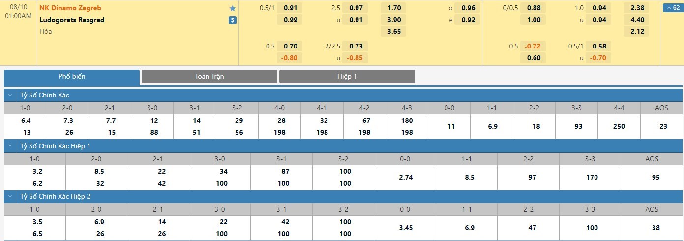 Tỷ lệ kèo được đưa ra ở cuộc đối đầu này là -3/4 trái nghiêng về đội chủ nhà Dinamo Zagreb và đây là điều không có gì bất ngờ. Rõ ràng để mang về cho mình cơ hội thắng kèo cao hơn thì các nhà đầu tư nên tin tưởng vào đoàn quân của HLV Ante Cacic ở cuộc đối đầu này. Sự ổn định là thứ có thể nhìn thấy ở Dinamo Zagreb khi họ duy trì mạch bất bại 5 trận liên tiếp gần đây, trong đó có 4 chiến thắng.