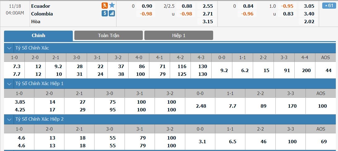 Tip kèo tỷ số hiệp 1: Ecuador 0-0 Colombia