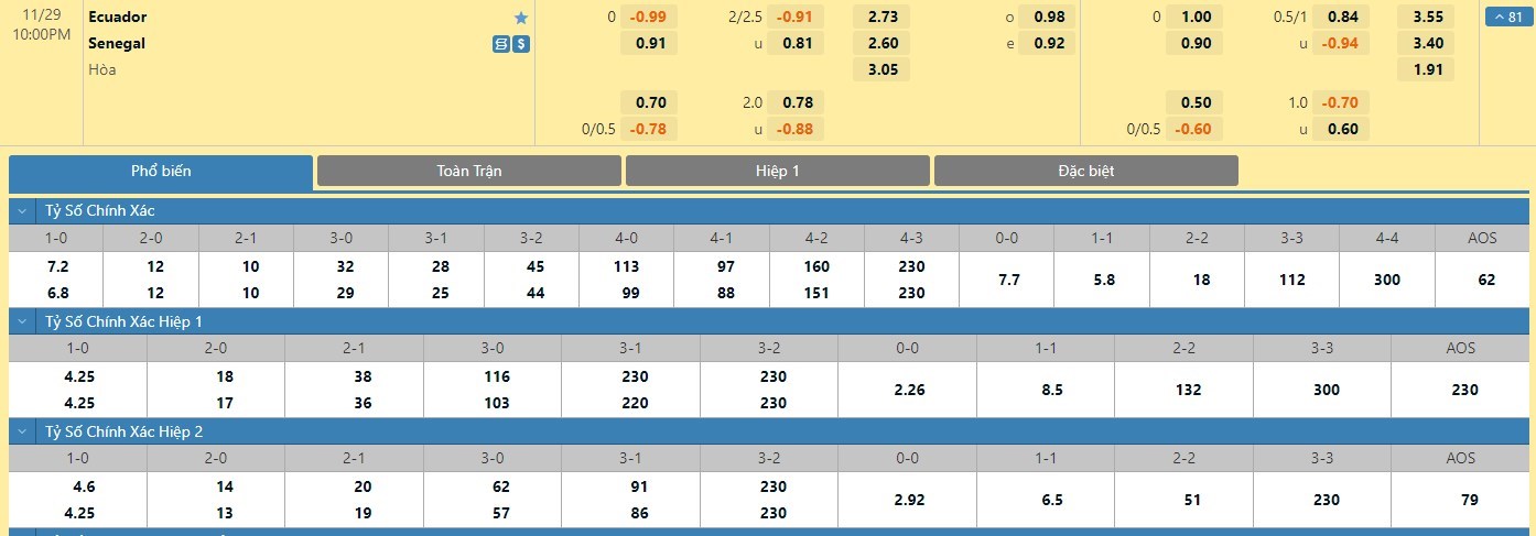 Tip kèo tỷ số hiệp 1: Ecuador 0-0 Senegal
