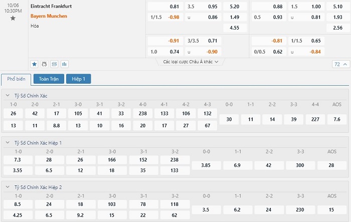 Tip kèo tỷ số hiệp 1: Eintracht Frankfurt 0-1 Bayern Munich