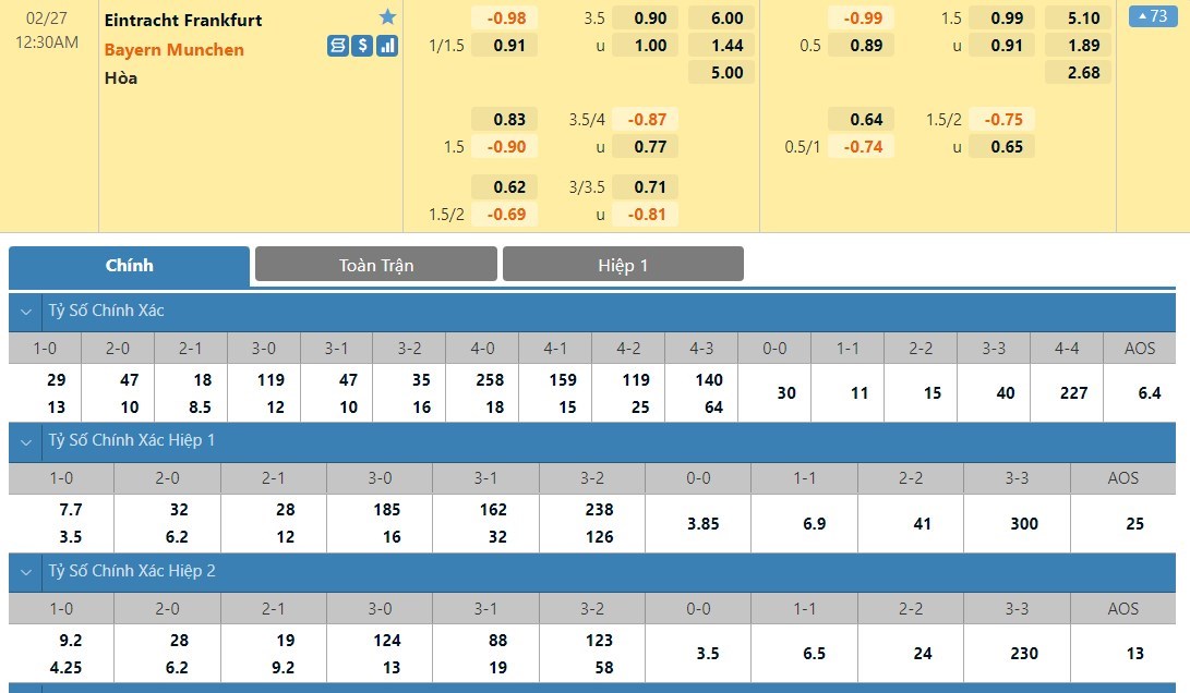 Tip kèo tỷ số hiệp 1: Eintracht Frankfurt 0-1 Bayern Munich