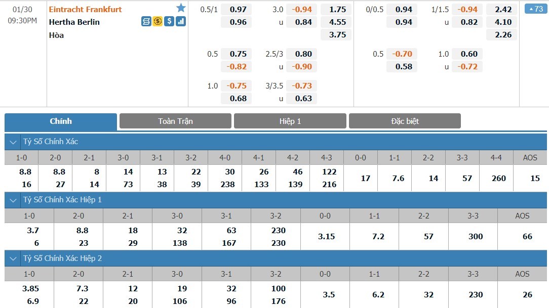 Tip kèo tỷ số hiệp 1: Eintracht Frankfurt 1-0 Hertha Berlin