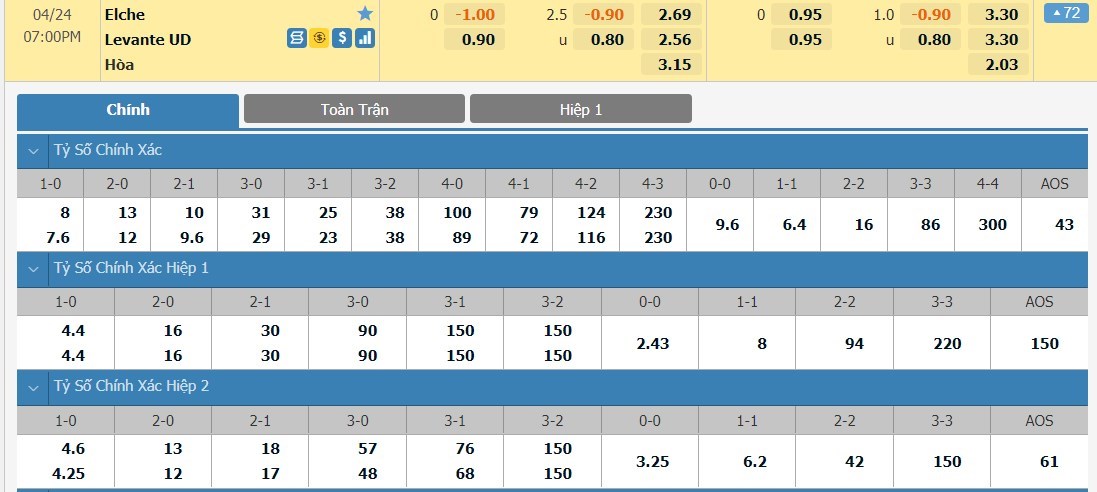 Tip kèo tỷ số hiệp 1: Elche 0-0 Levante
