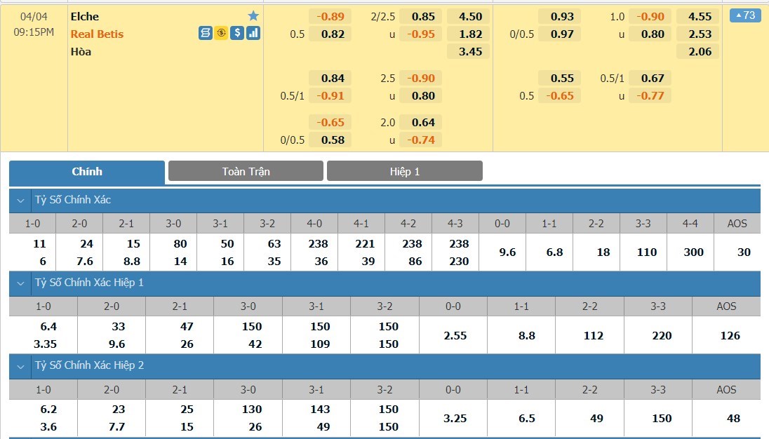 Tip kèo tỷ số hiệp 1: Elche 0-1 Real Betis