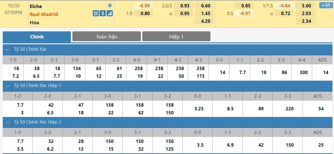 Tip kèo tỷ số hiệp 1: Elche 0-1 Real Madrid