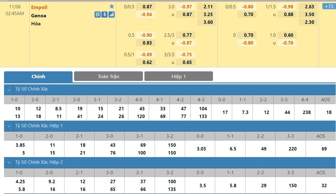 Tip kèo tỷ số hiệp 1: Empoli 1-1 Genoa