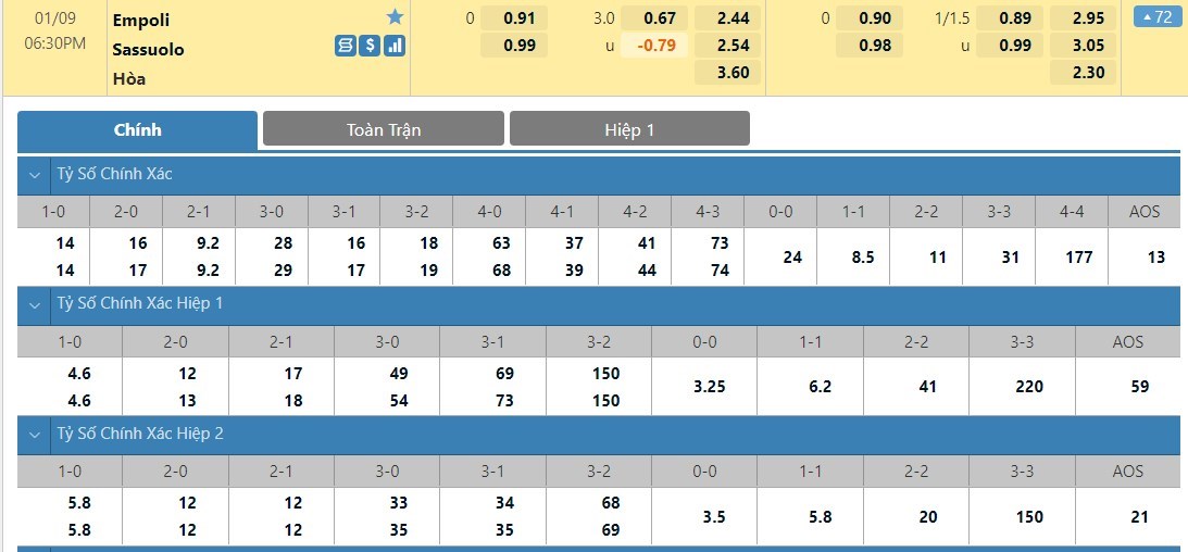 Tip kèo tỷ số hiệp 1: Empoli 1-1 Sassuolo