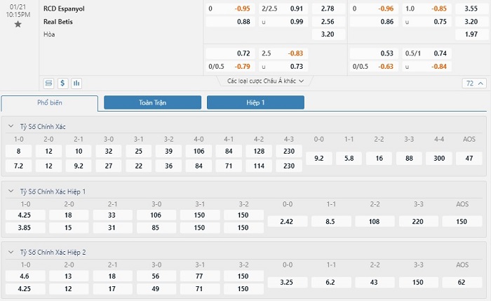 Sẽ là áp lực không hề nhỏ cho Espanyol dù cho họ được chơi trên sân nhà trong trận này. Lần gần nhất hai đội đối đầu cũng diễn ra trên chính sân nhà của Espanyol thì Real Betis đã để thua đậm với tỷ số 1-4. Xét rộng ra trong 10 cuộc đọ sức gần nhất giữa hai đội bóng này, chỉ có 1 chiến thắng dành cho Espanyol, còn lại là 5 trận hòa và 4 chiến thắng thuộc về Real Betis. Đặc biệt, trong con mắt của đội ngũ chuyên môn thì Espanyol không phải ô cược tiềm năng. Thống kê 8 trận đấu được chơi trên sân nhà thuộc khuôn khổ La Liga từ đầu mùa đến nay thì có tới 6 trận họ thua kèo châu Á. Trong khi đó Real Betis lại thắng cả 2 trận đấu gần nhất trên sân khách.