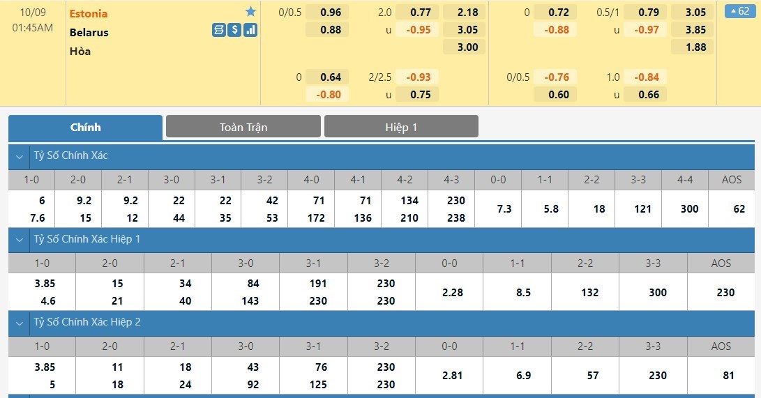 Tip kèo tỷ số hiệp 1: Estonia 1-1 Belarus