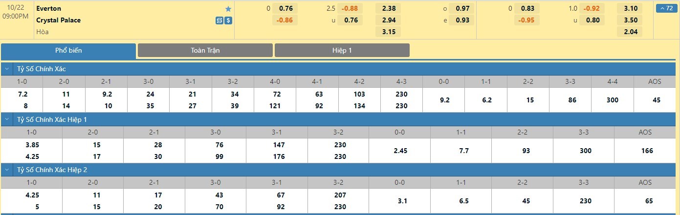 Trong 5 trận đấu gần nhất đôi bên đụng độ trực tiếp, Everton chỉ có 1 trận đấu mang về được cho mình ít nhất là 1 bàn thắng trong hiệp đấu đầu tiên. Còn với Crystal Palace, đội bóng này đã có 4 lần làm được điều tương tự trong 45 phút đầu tiên. Với tỷ lệ kèo hiệp 1 ở trận đấu này được đưa ra là đồng banh thì người chơi nên tin tưởng vào kịch bản hai đội sẽ bất phân thắng bại trong nửa đầu trận.