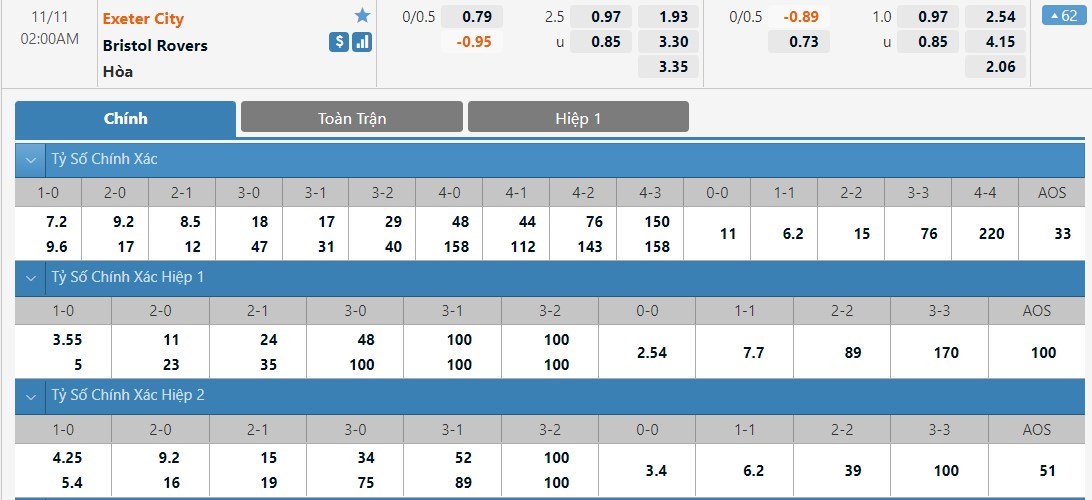 Tip kèo tỷ số hiệp 1: Exeter 1-1 Bristol Rovers