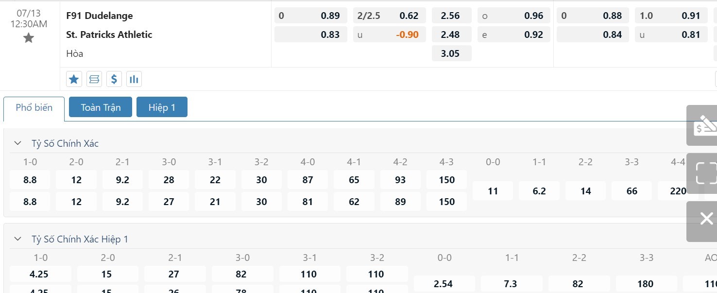 Tip kèo tỷ số hiệp 1: F91 Dudelange 0-0 St. Patrick's Athletic
