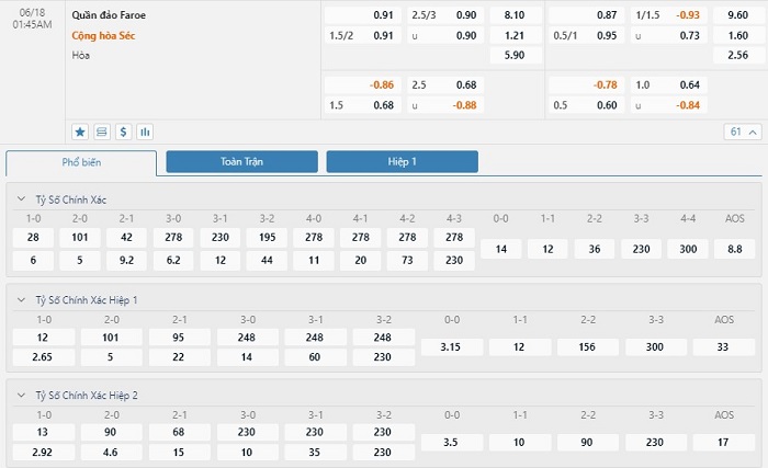 Trong 5 trận đấu gần nhất của mình, Faroe Islands đã có 2 trận đấu mang về được cho mình ít nhất là 1 bàn thắng trong hiệp đấu đầu tiên. Còn với Cộng hòa Séc, đội bóng này đã có 3 lần làm được điều này trong 45 phút đầu tiên. Với tỷ lệ -3/4 trái thì các nhà đầu tư nên tin tưởng vào đội khách ở trong hiệp đấu đầu tiên này.