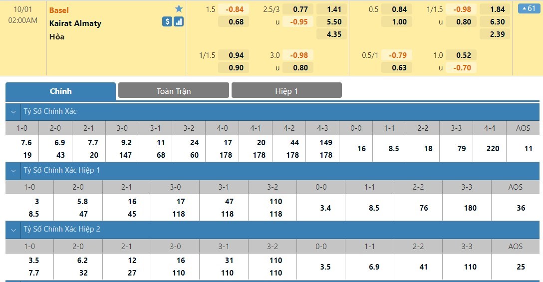 Kairat Almaty nói gì thì nói cũng chỉ là đội bóng đến từ giải VĐQG Kazakhstan - giải đấu mà chất lượng chuyên môn rõ ràng thua kém so với sân chơi của đội chủ nhà. Dù trong quá khứ FC Basel và Kairat Almaty chưa từng chạm trán với nhau nhưng đội ngũ chuyên môn vẫn có thể đưa ra mốc chấp chênh lệch khi đặt chủ nhà FC Basel vào vị thế cửa trên cùng mốc chấp -1 1/2 trái. Nhìn vào cách ra kèo như vậy thì rõ ràng là đội ngũ chuyên môn tin tưởng 3 điểm khó thoát khỏi tay FC Basel, vấn đề chỉ là đội chủ nhà sẽ thắng cách biệt bao nhiêu bàn mà thôi. Thông tin tích cực là cả 3 trận thắng gần đây, các chân sút bên phía FC Basel đều ghi tối thiểu 2 bàn mỗi trận.