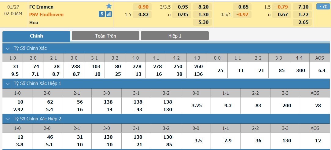 Tip kèo tỷ số hiệp 1: FC Emmen 0-1 PSV Eindhoven