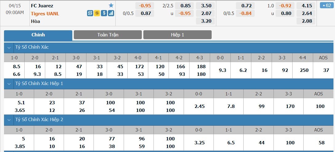 Tip kèo tỷ số hiệp 1: FC Juarez 0-0 Tigres