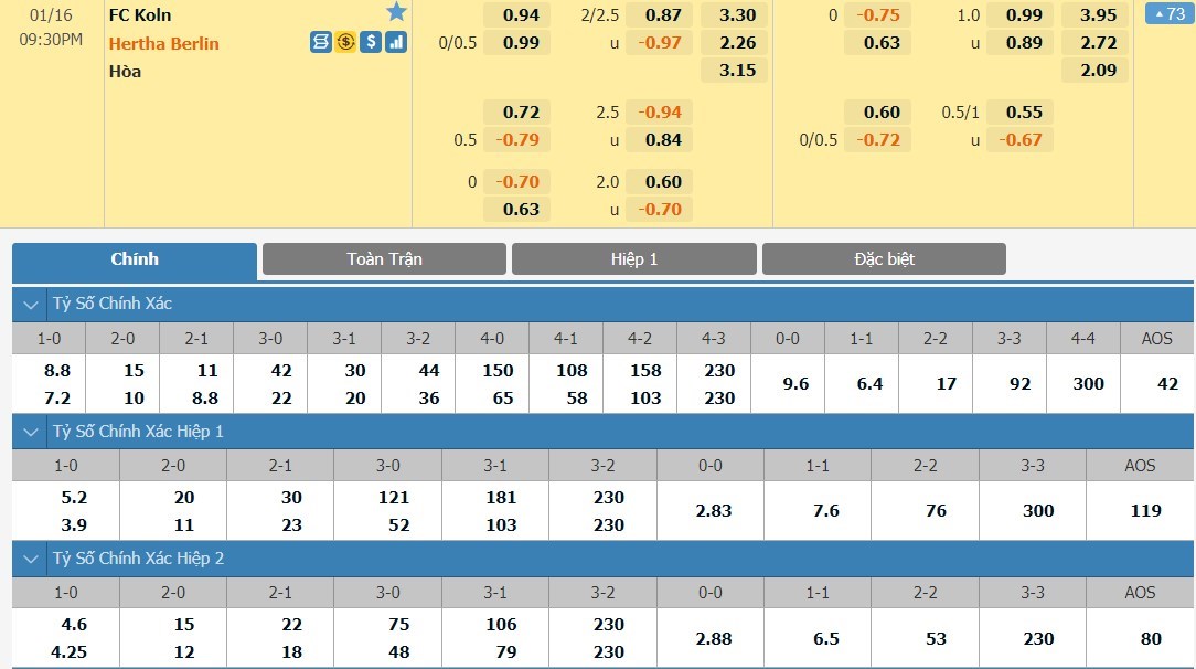 Tip kèo tỷ số hiệp 1: FC Koln 0-0 Hertha Berlin