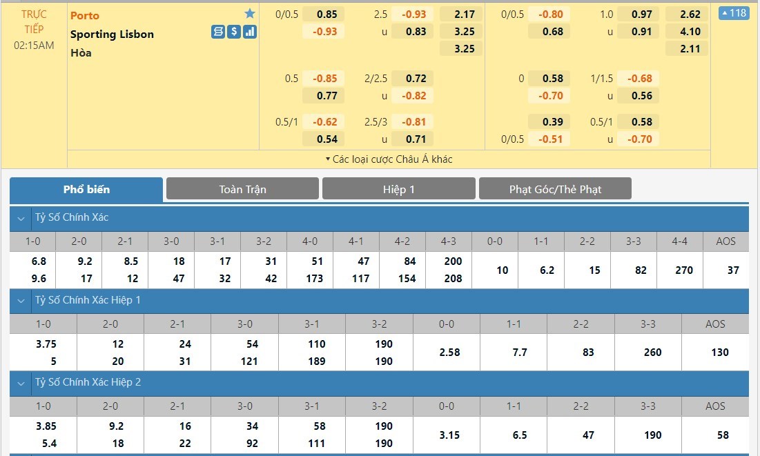 Tip kèo tỷ số hiệp 1: FC Porto 1-0 Sporting CP