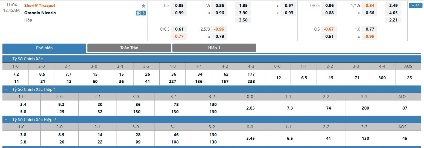 Tip kèo tỷ số hiệp 1: FC Sheriff 1-0 Omonia Nicosia