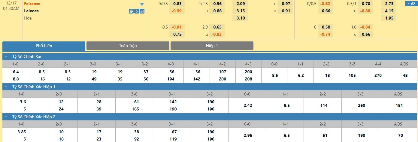 Trong 5 trận đấu gần nhất đôi bên đụng độ nhau trực tiếp, Feirense đã có 2 trận đấu mang về được cho mình ít nhất là 1 bàn thắng trong hiệp đấu đầu tiên. Còn với Leixoes, đội bóng này đã có 2 lần làm được điều này trong 45 phút đầu tiên. Với tỷ lệ kèo hiệp 1 là chủ nhà chấp 1/4 trái thì người chơi nên tin tưởng vào kịch bản có lợi dành cho đội khách trong nửa đầu trận.