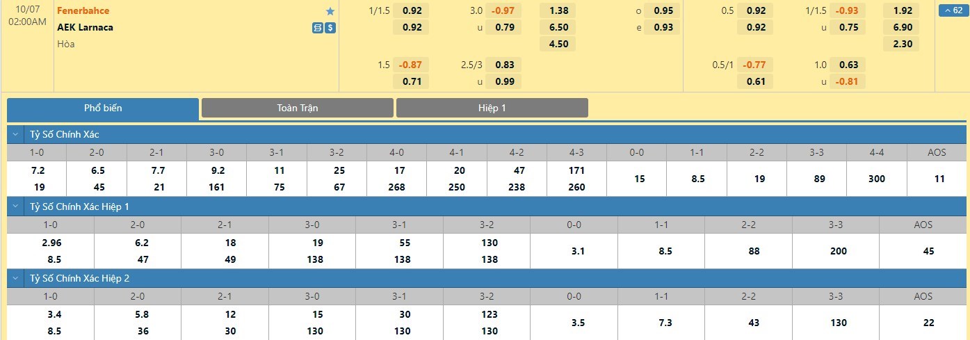 Tip kèo tỷ số hiệp 1: Fenerbahce 1-0 AEK Larnaca