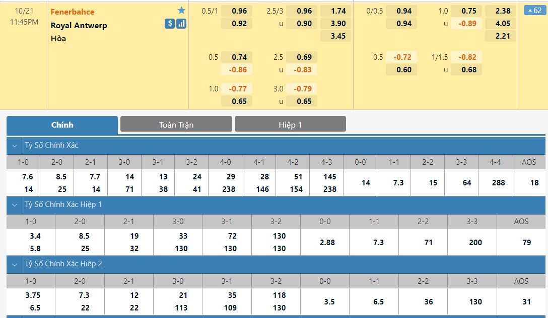 Tip kèo tỷ số hiệp 1: Fenerbahce 0-0 Royal Antwerp