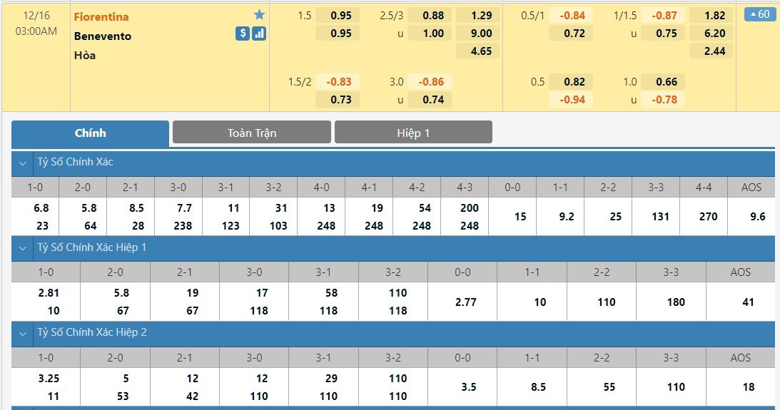 Tip kèo tỷ số hiệp 1: Fiorentina 2-0 Benevento