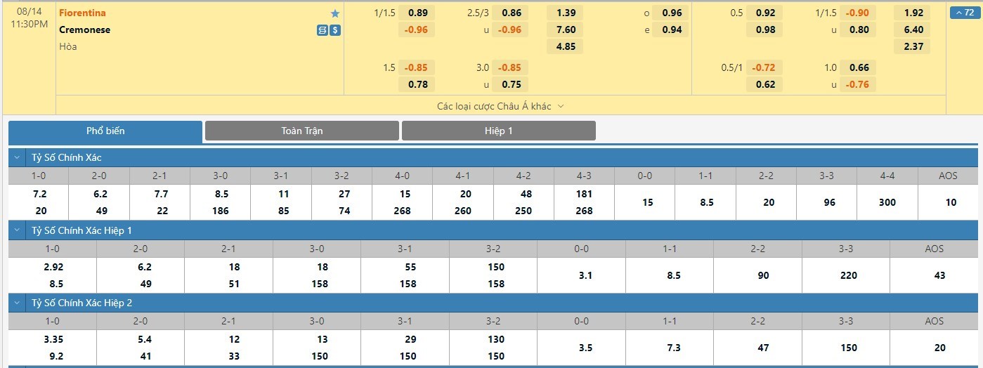 Tỷ lệ kèo được đưa ra ở cuộc đối đầu này là -1 1/4 trái nghiêng về Fiorentina và điều này là không có gì bất ngờ. Không có gì phải bàn cãi khi mà Fiorentina là đội bóng có đẳng cấp cao hơn khá nhiều so với Cremonese ở màn đụng độ này. Do đó, để mang về cho mình cơ hội thắng kèo cao hơn thì các nhà đầu tư vẫn nên tin tưởng vào đoàn quân của HLV Vincenzo Italiano ở cuộc đối đầu này.