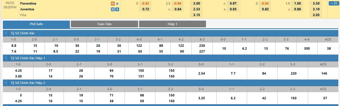 Trong 5 trận đấu gần nhất hai đội bóng này chạm trán nhau trực tiếp, Fiorentina đã có 2 trận đấu mang về được cho mình ít nhất là 1 bàn thắng trong hiệp đấu đầu tiên. Còn Juventus chỉ có 1 lần làm được điều này. Tỷ lệ kèo hiệp 1 ở trận đấu này được đưa ra là đồng banh và người chơi nên tin tưởng vào kết quả Hòa.